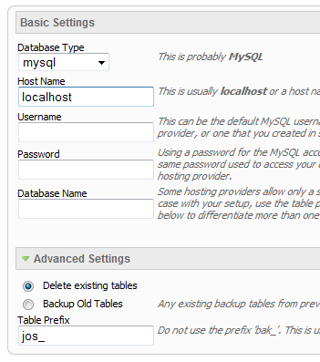 - At the above screen be sure to enter localhost as shown, continue to fill in the following text fields with your newly created database and username information